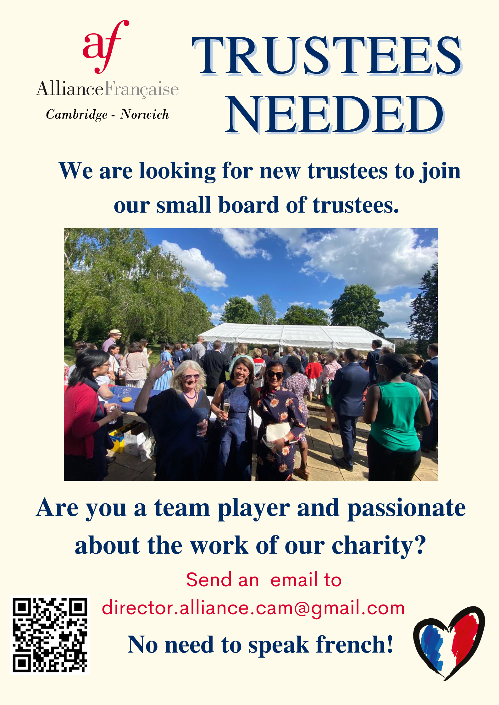 The Alliance Française Cambridge-Norwich-East-Anglia is a charity and is part of the Paris Fondation des Alliances Francaises, the world's largest language network with over 820 branches in 135 countries and the leading organisation for the teaching of French and promotion of Francophone cultures. The Alliance Française in Cambridge was created in 1982, and a branch in Norwich was later established, allowing the organisation to serve more communities across East Anglia. It is an exciting time to join the organisation