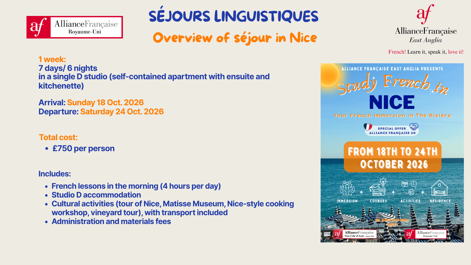 Séjour linguistique Nice - 18th to 24th October 2026